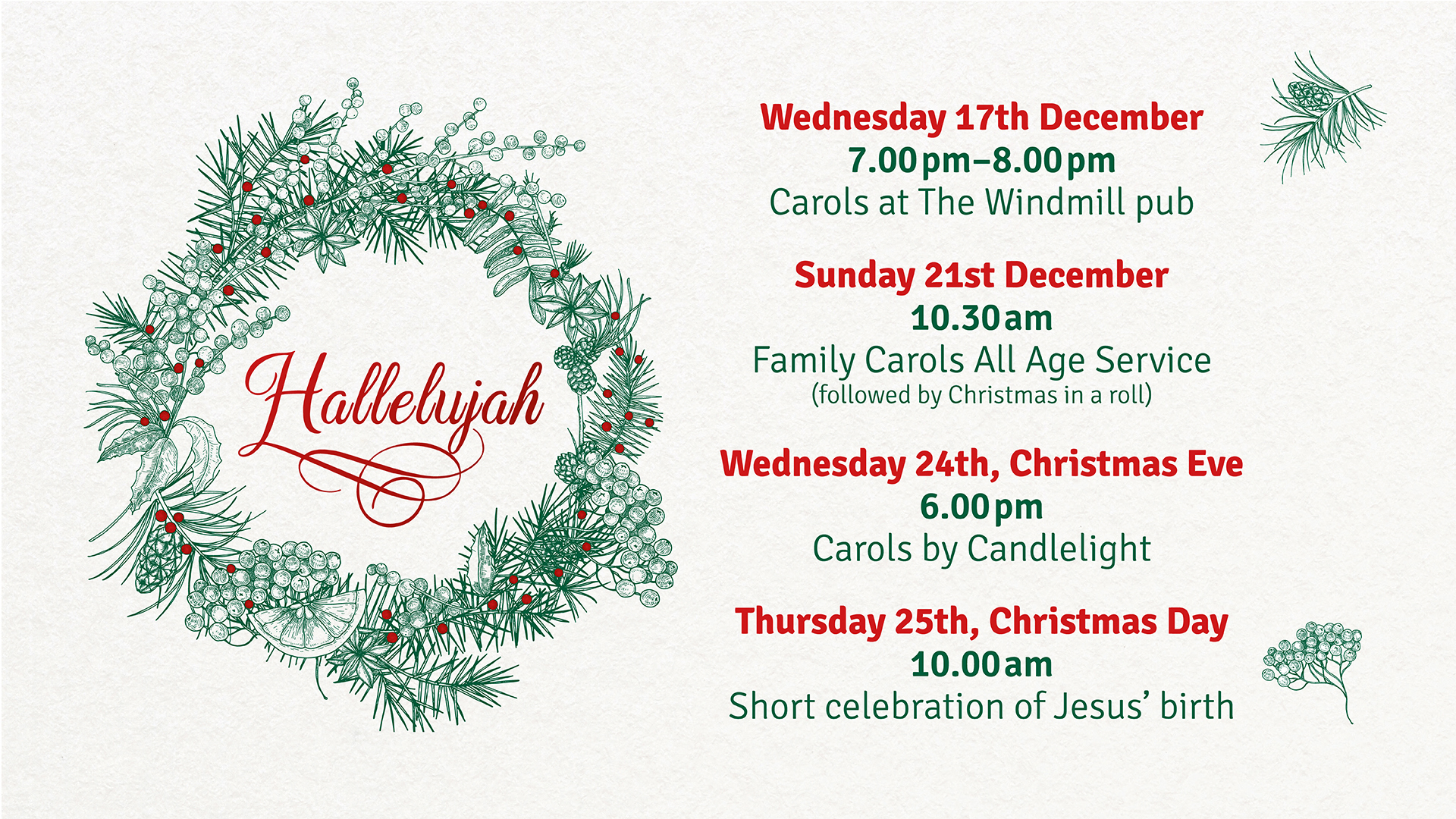 If you want to get in the groove early then come and join with us as we sing Carols at the Windmill and then you’re invited to our all age, family focused Christmas service on the 21st which will be followed by a very big Christmas dinner served in a roll (just the exciting stuff – not the Brussel sprouts). Then on Christmas Eve we have our Candlelit Carols Service and finally, to celebrate Christmas Day together we have a short service on Christmas Day to give thanks for the greatest gift ever given to mankind.
